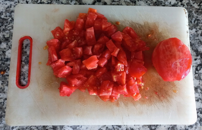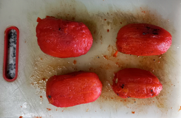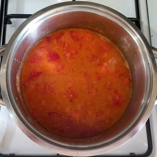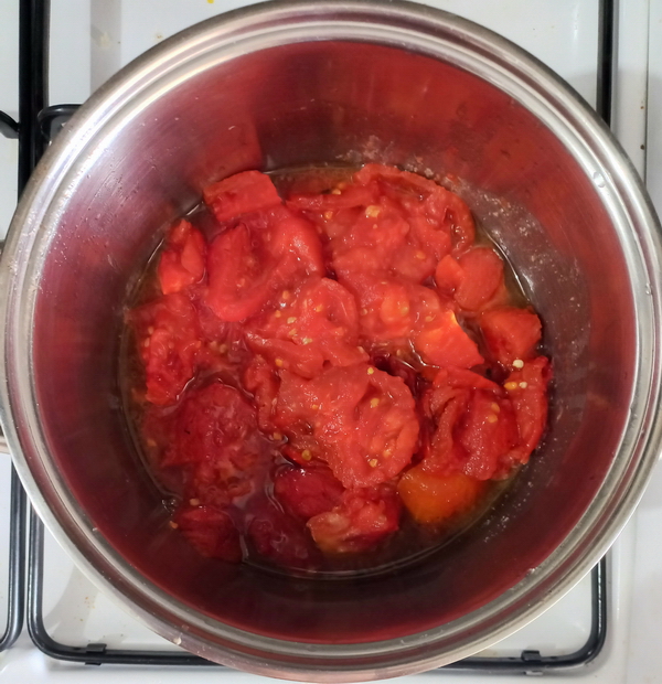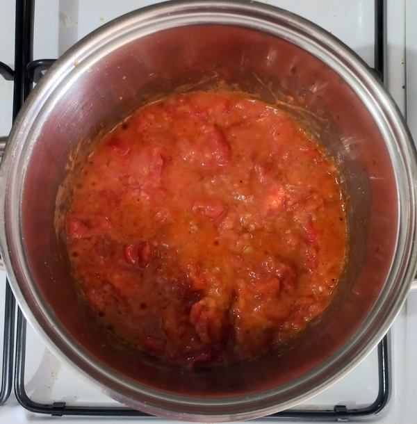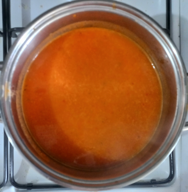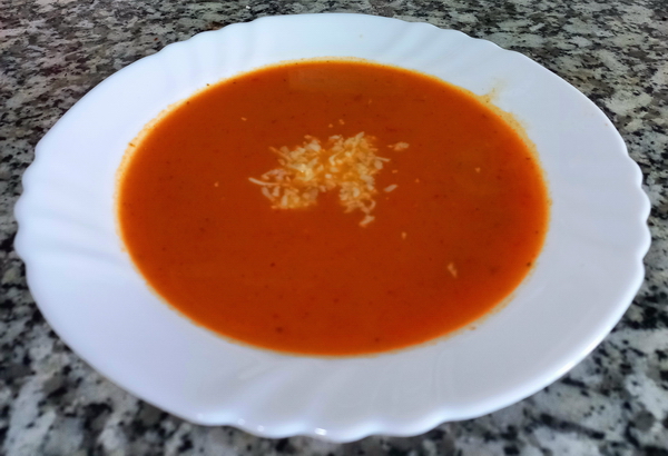 Közlenen domatesler, birkaç dakika kavrulur. Daha sonra standart domates çorbasindaki tarif izlenir.